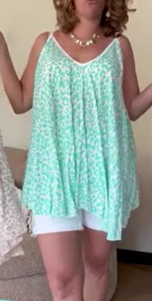 Vrouwelijke, losvallende top met mintgroene panterprint. Voorzien van een V-hals, spaghettibandjes en een luchtige A-lijn pasvorm. Ideaal voor zomerse dagen en makkelijk te combineren met shorts of jeans.